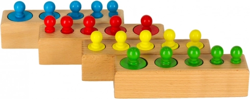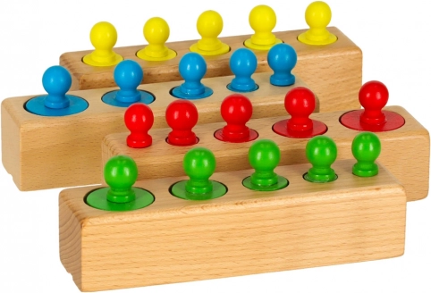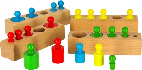 Dřevěná montessori skládačka s barevnými válci. Rozvíjí motoriku, logiku a učení barev i počítání. Bezpečné dřevo, netoxické barvy, mnoho způsobů hry.