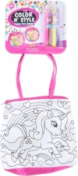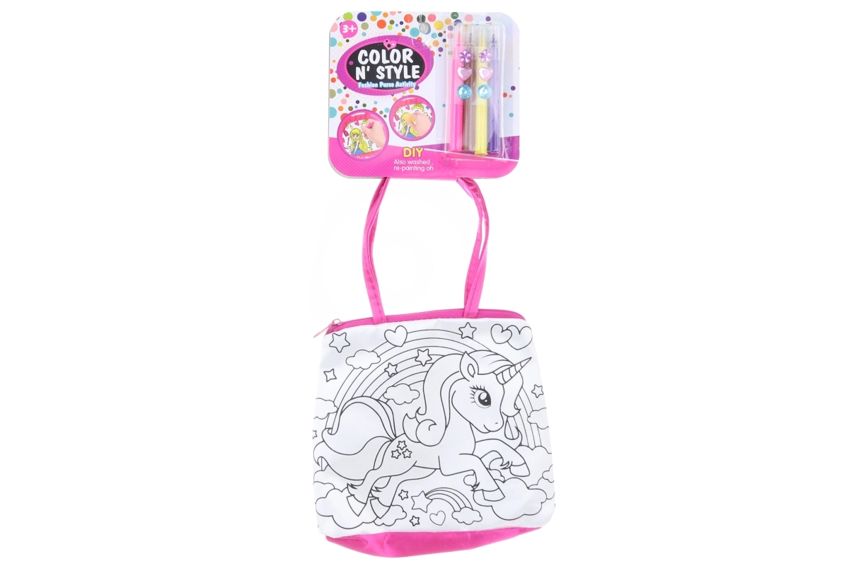 Kreativní sada pro malé umělce: vybarvovací kabelka s rozměry cca 16 × 16 cm, která obsahuje 4 speciální textilní fixy a ozdobné kamínky. Ideální pro rozvoj kreativity, jemné motoriky a originální styl. Vhodné pro děti od 3 let.