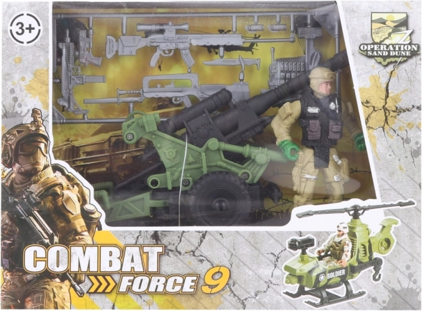 Vojenská sada s kanónem pro děti 3+. Obsahuje vojáčka a doplňky, podporuje fantazii a motoriku. Kompaktní rozměry balení 23 × 17 × 6,5 cm.