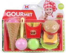 Zábavná dětská sada plastových potravin s táckem pro hraní na kuchyň či restauraci. Obsahuje zmrzlinu v kornoutku, kopeček zmrzliny s naběračkou, makronku, hranolky a hamburger rozložitelný na jednotlivé ingredience. Ideální pro rozvoj fantazie, jemné motoriky a společné hraní.
