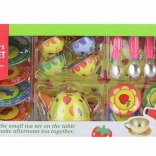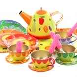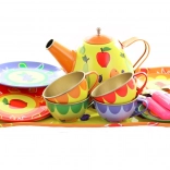 Rozjasněte dětské odpoledne s tímto barevným plechovým čajovým setem pro malé hostitele. Set obsahuje konvičku, tác, hrnečky, podšálky, talířky a lžičky – vše s veselými ovocnými a květinovými motivy. Odolné provedení z plechu je ideální pro hraní na čajový dýchánek, podporuje fantazii, role-play a společenskou interakci. Vhodné pro děti od 3 let.