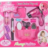 Součástí je funkční fén na baterie (napájení 1× AA, není součástí balení), bezpečné dětské nástroje a praktický kapsář pro přehledné uložení všech kadeřnických pomůcek.