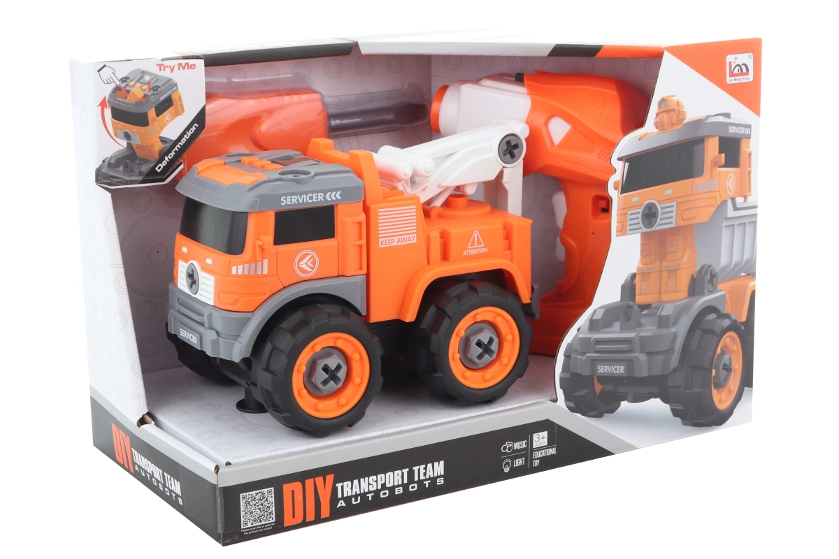 Zábavná stavebnice a RC hračka v jednom! Tato šroubovací odtahovka se dá pomocí přiloženého šroubováku nebo vrtačky snadno rozložit a znovu složit, navíc ji můžete transformovat na robota. Vyjímatelný motorek z vrtačky se vloží do auta a to poté jezdí na dálkové ovládání dopředu i dozadu. Hračka svítí a vydává zvuky, podporuje jemnou motoriku a kreativitu dětí. Ideální pro děti od 3 let.
