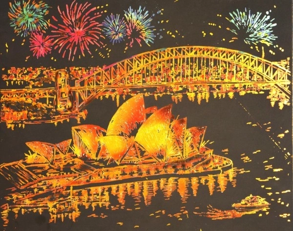 Objevte kouzlo škrabací techniky: pod černou vrstvou se ukrývá zlatý podklad, který z každého vyškrábaného tahu vytváří kontrastní, elegantní efekt. Motiv ikonické Opery v Sydney v nočním provedení potěší začátečníky i pokročilé a výsledný obrázek se stane originální dekorací.