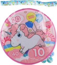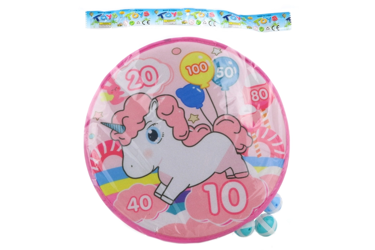 Zábavný dětský terč s motivem jednorožce o průměru cca 35 cm se šesti míčky na suchý zip pro bezpečné házení. Ideální pro rozvoj motoriky, přesnosti a koordinace oko–ruka u dětí od 3 let.