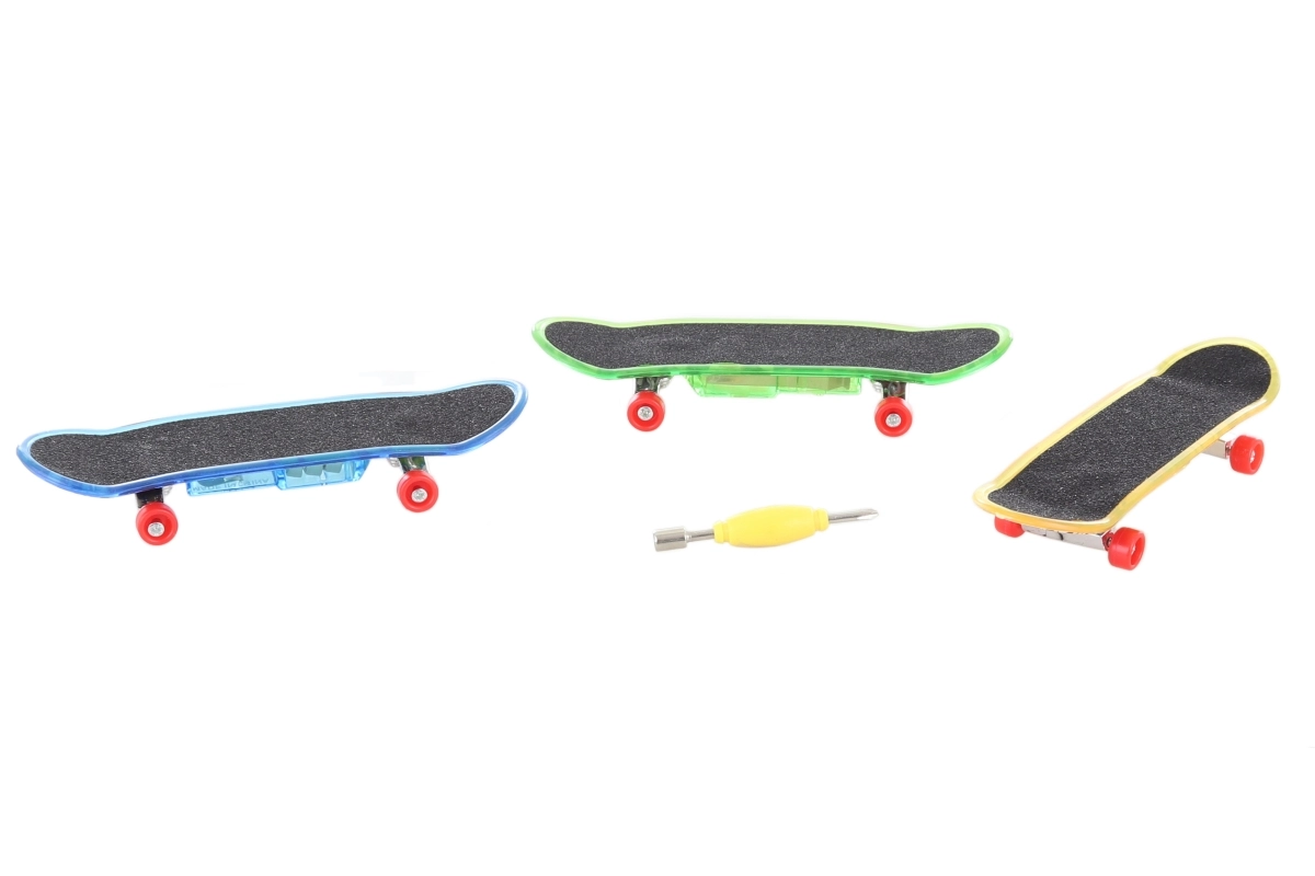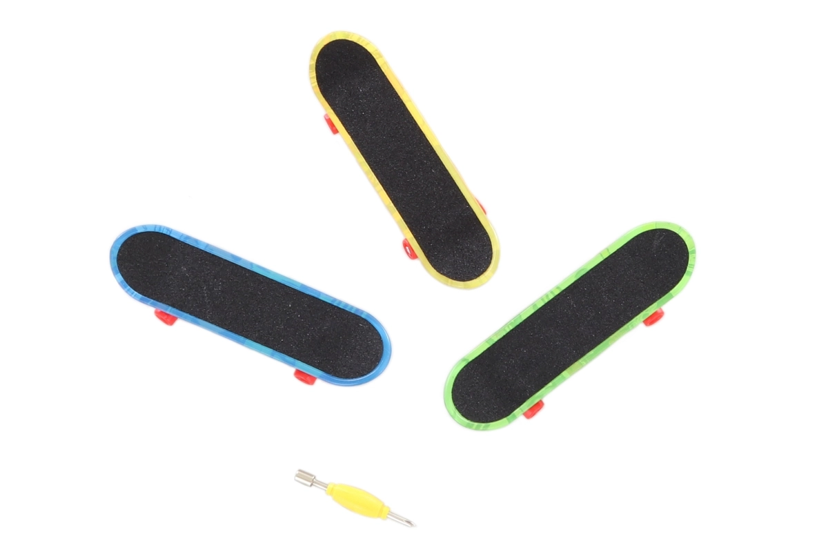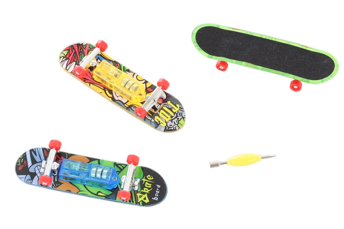 V balení najdete 3 mini skateboardy a nástroj pro šroubování. Baterie AG13 jsou součástí, takže můžete začít hned.