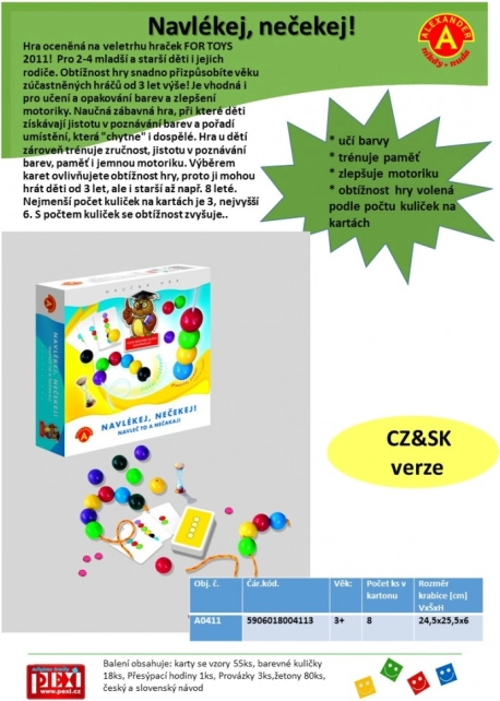 Rodinná hra Navlékej, nečekej! od Pexi je ideální pro společné chvíle s dětmi. Podporuje rozpoznávání barev, paměť, koordinaci oko–ruka a jemnou motoriku. Díky různému počtu kuliček na kartách snadno nastavíte úroveň náročnosti, takže se skvěle hodí pro děti od 3 do cca 8 let i pro dospělé.