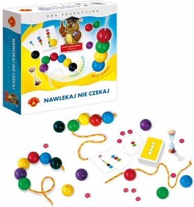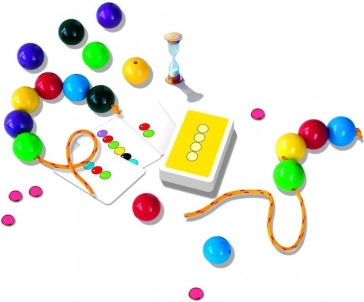 Pravidla jsou jednoduchá: otočíte vzorovou kartu, zapamatujete si pořadí barevných kuliček a co nejrychleji je navléknete na provázek. Přesýpací hodiny můžete použít pro napínavější hru nebo je u menších dětí vynechat. Za správně umístěné kuličky získáváte žetony a vyhrává hráč s nejvyšším počtem bodů.