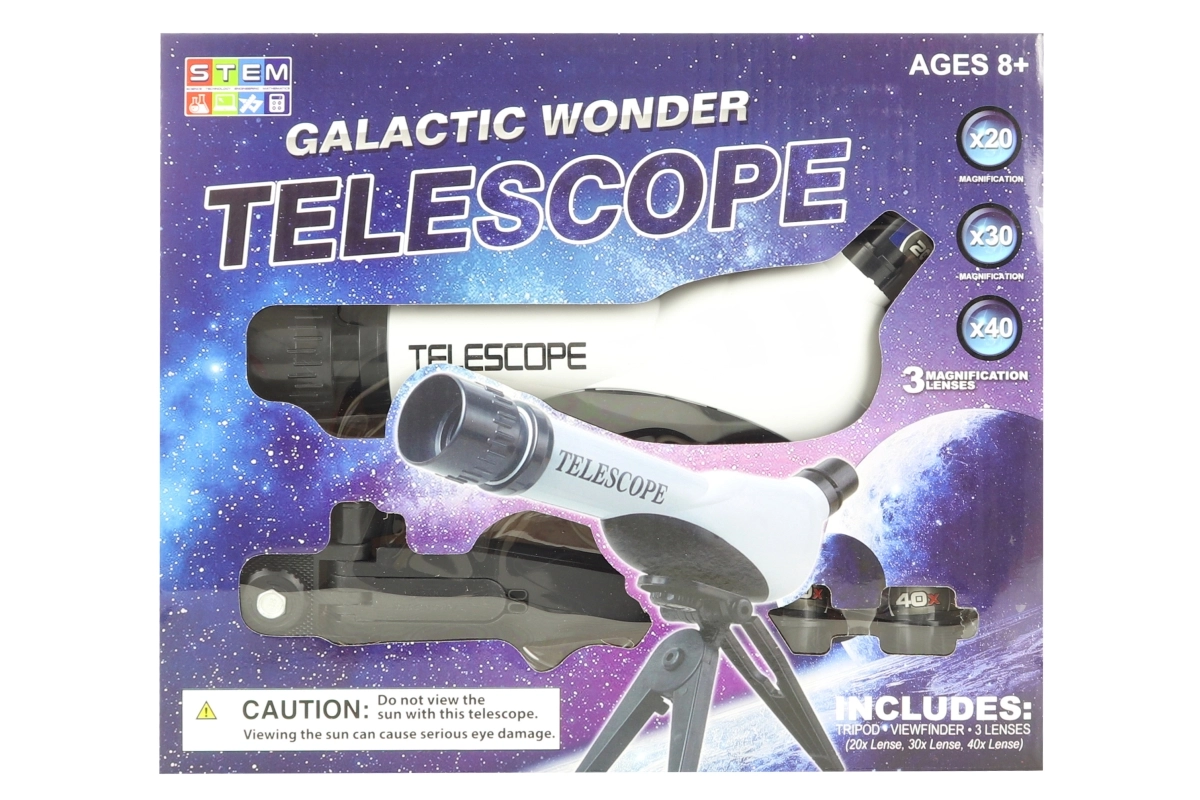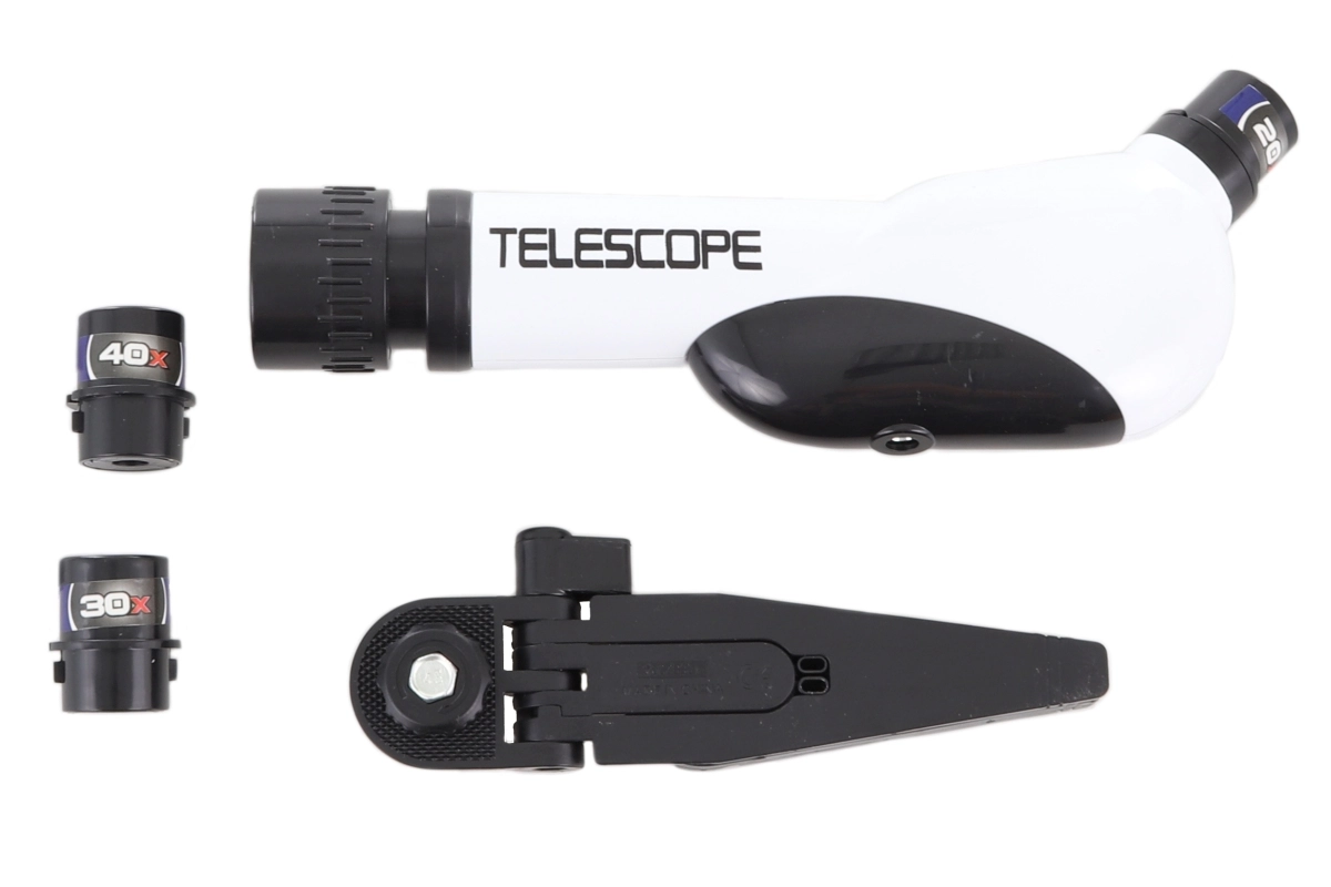Objevte noční oblohu s tímto plastovým dětským teleskopem se stojanem, který nabízí průměr objektivu 60 mm, zvětšení 20×, 30× a 40× a snadné zaostřování na 170 mm. Ideální pro začínající astronomy od 8 let.