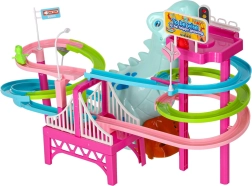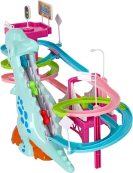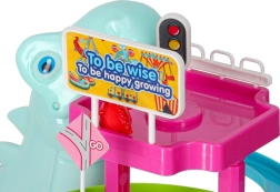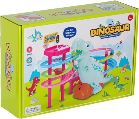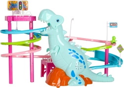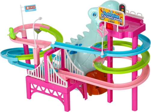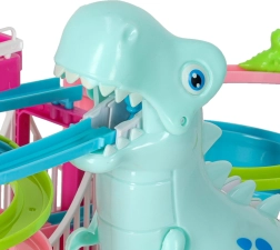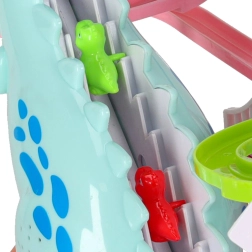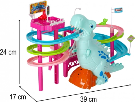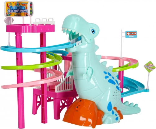 Tato barevná závodní dráha s tematickým dinosaurem nadchne malé i větší děti. Jakmile se autíčka ve tvaru dinosauřat rozjedou, velký dinosaurus vydává realistické řvoucí zvuky a dráhu rozzáří LED světla. Jediný vypínač pohodlně ovládá pohyb i efekty, takže se děti mohou plně soustředit na hru.