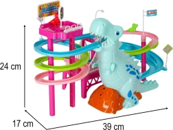 Zábavná závodní dráha s velkým dinosaurem, který požírá malé dinosaury–autíčka, nabízí dětem hodiny hry plné světel a zvuků. LED efekty, řvoucí dinosaurus a automatický pohyb řízený jedním vypínačem rozvíjejí motoriku, koordinaci ruka–oko i kreativitu. Lze napájet bateriemi AA nebo přiloženým kabelem USB.