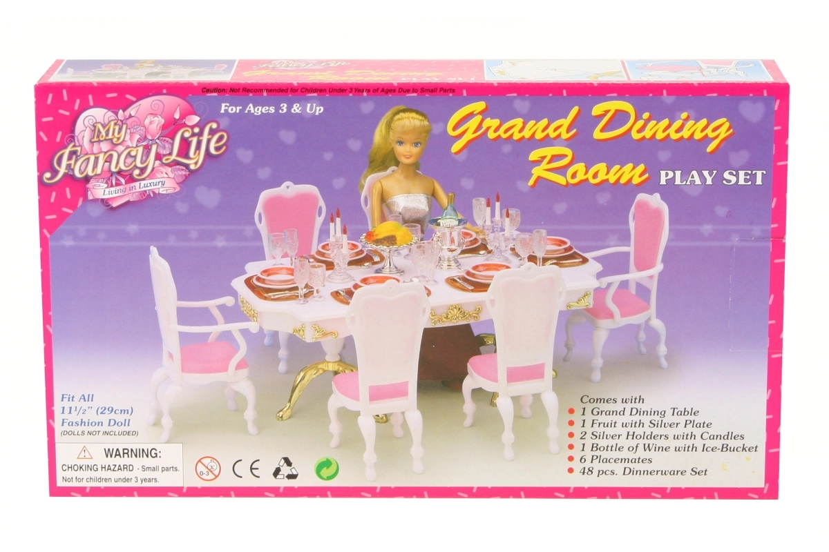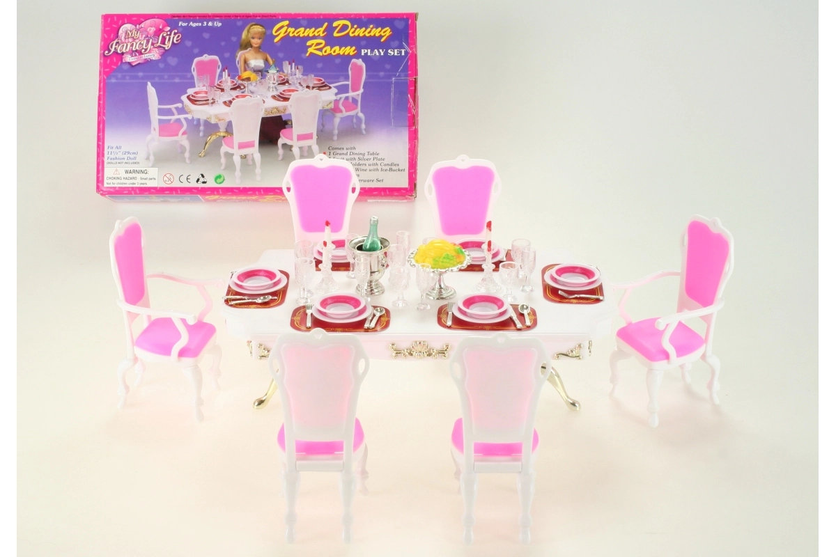 Stylová sada Glorie pro panenkové stolování promění každý pokojíček v elegantní jídelnu. Obsahuje velký plastový stůl, 6 židlí (2 s područkami) a bohaté prostření stolu včetně skleniček, talířů a příborů. Ideální pro kreativní hru dětí od 3 let.