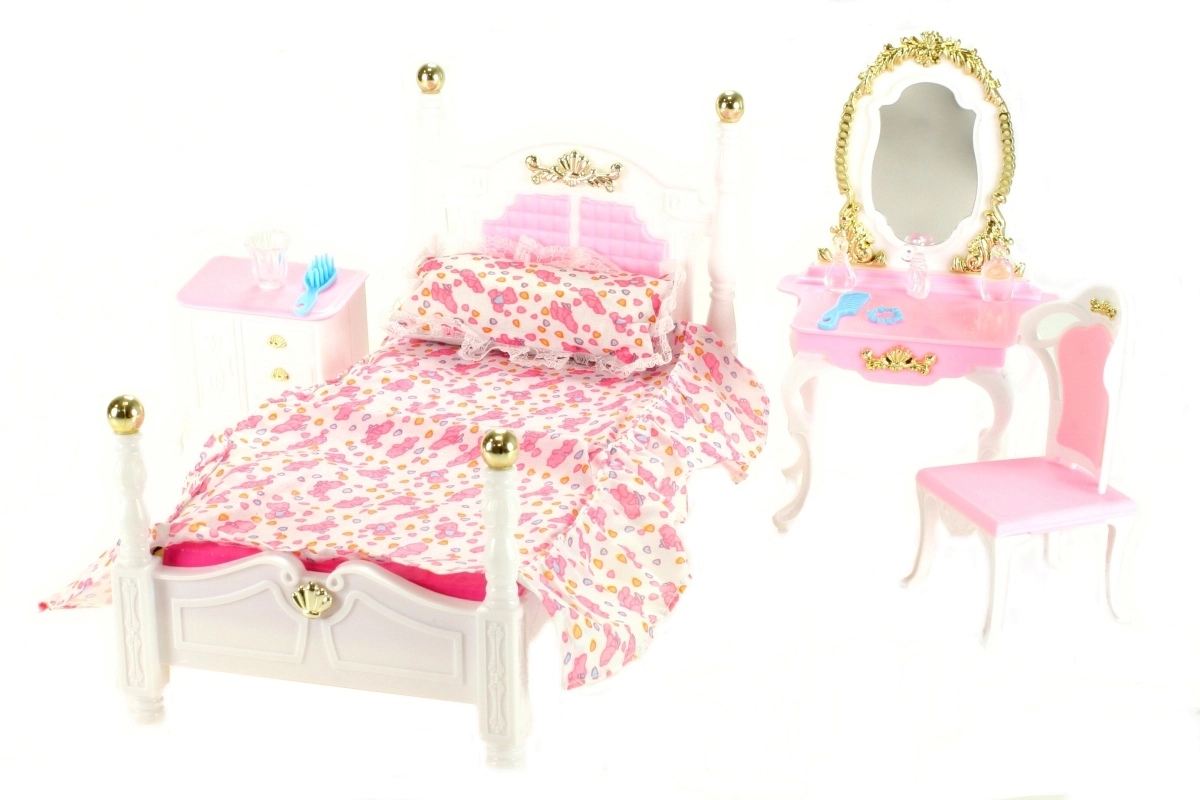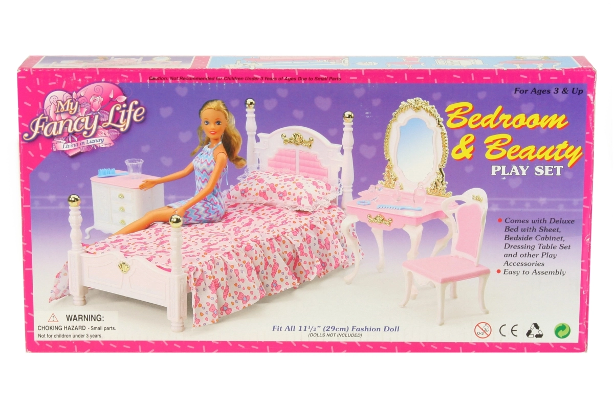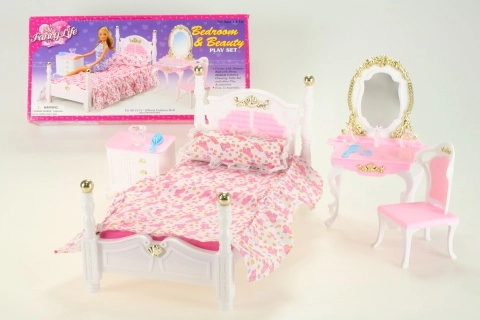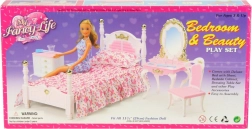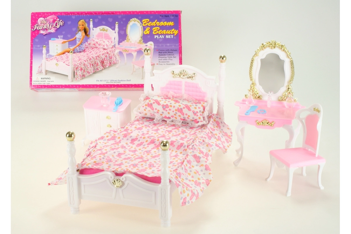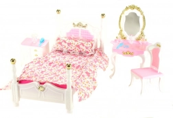Součástí je komfortní postel s textilním přehozem a polštářkem, kosmetický stolek s praktickými doplňky pro péči o panenku, pohodlné křeslo a noční stolek. Vše v ladícím designu, který skvěle zapadne do pokojíčku panenky.