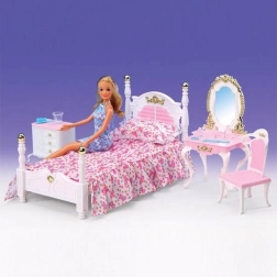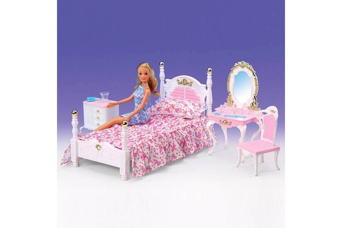 Stylová sada nábytku Glorie ložnice promění dětský pokojíček pro panenky v útulné místo pro hraní. Obsahuje postel s přehozem a polštářkem, kosmetický stolek s doplňky, křeslo a noční stolek. Ideální pro rozvoj fantazie a kreativní hru. Panenka není součástí balení.