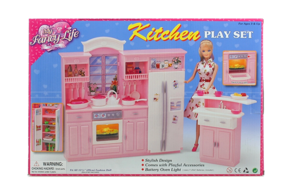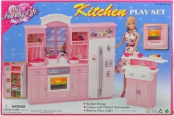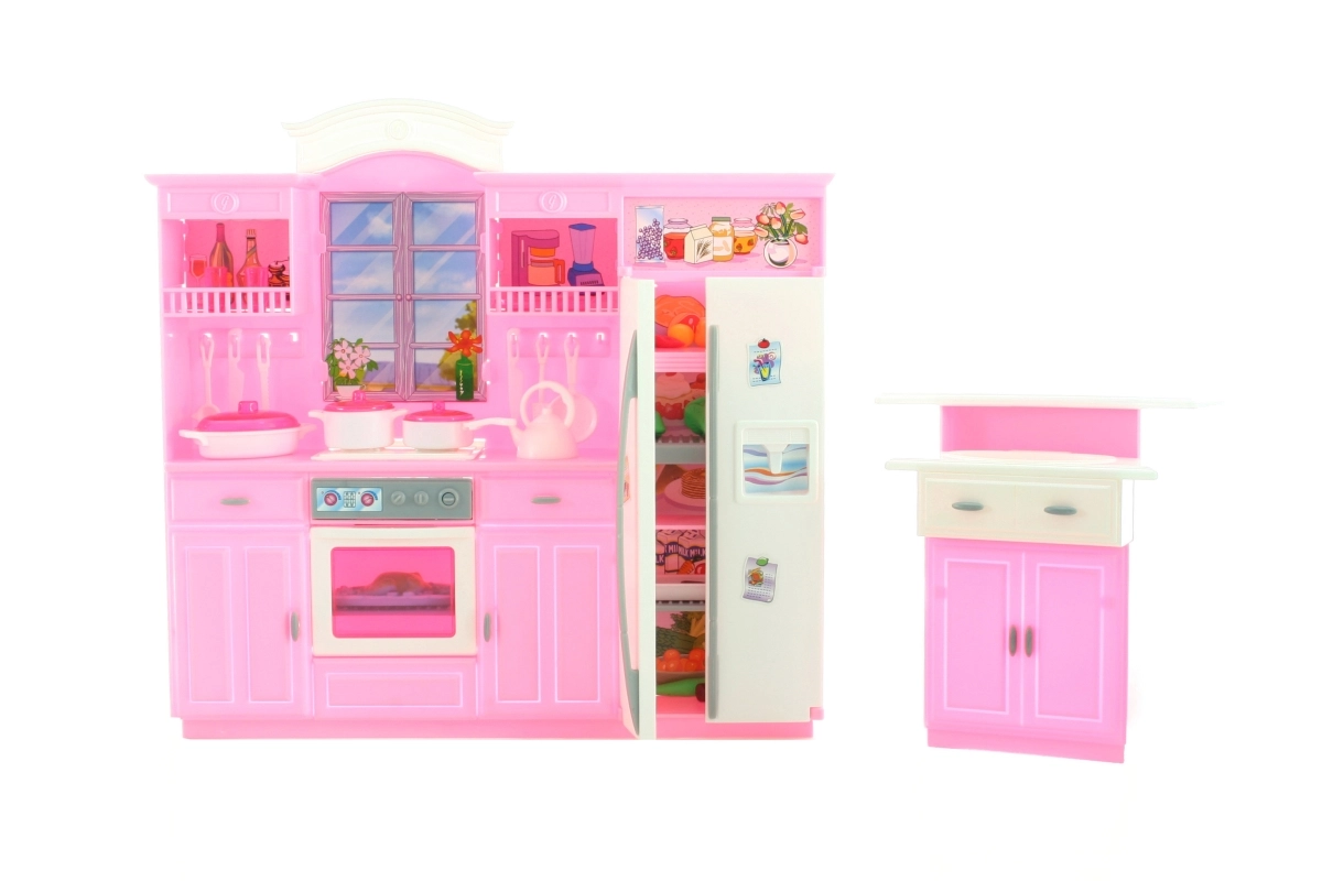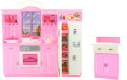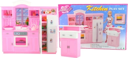 Součástí je kuchyňská linka s lednicí a vestavěnou troubou a samostatný dřez. Díky kompaktním rozměrům se set vejde do většiny dětských pokojů a lze jej snadno kombinovat s dalšími doplňky pro panenky. Panenka není součástí balení.