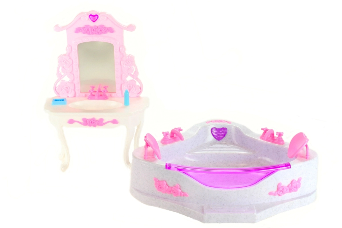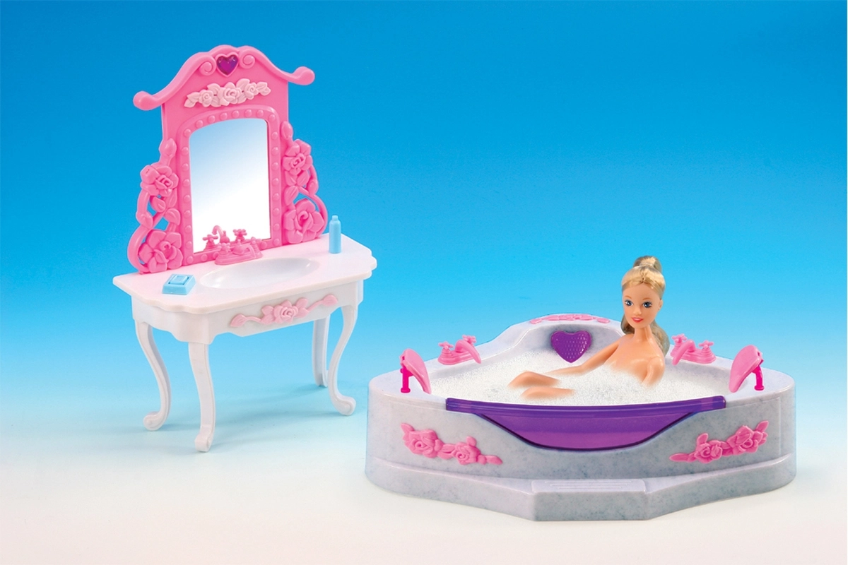Tato koupelnová sada GLORIA je skvělým doplňkem do domečku pro panenky. Rohová vana a volně stojící umyvadlo se zrcadlem vytvářejí realistické prostředí, ve kterém si děti mohou přehrávat scénky z každodenního života a rozvíjet tak svou představivost.