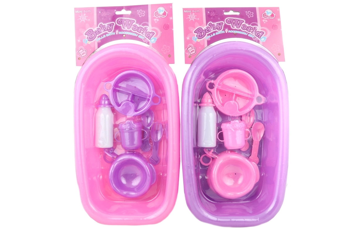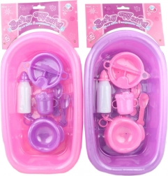 Dopřejte své malé mamince dokonalou péči o její oblíbenou panenku s touto praktickou plastovou vaničkou. Součástí je bohatá sada doplňků – nočník, lahvička, hrneček s pítkem, lžička, vidlička a jídelní miska – vše pro zábavné a realistické hraní.