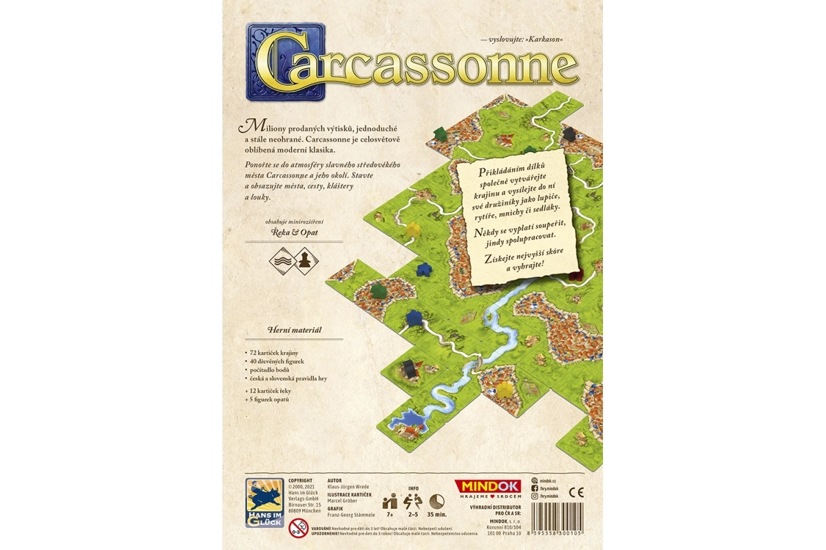 Základní vydání přináší vše potřebné pro plynulou hru a navíc obsahuje minirozšíření Řeka, které zpestří začátek partie, a 5 figurek opatů pro nové taktické možnosti. Díky krátké herní době a variabilitě je Carcassonne ideální pro začátečníky i zkušené hráče.