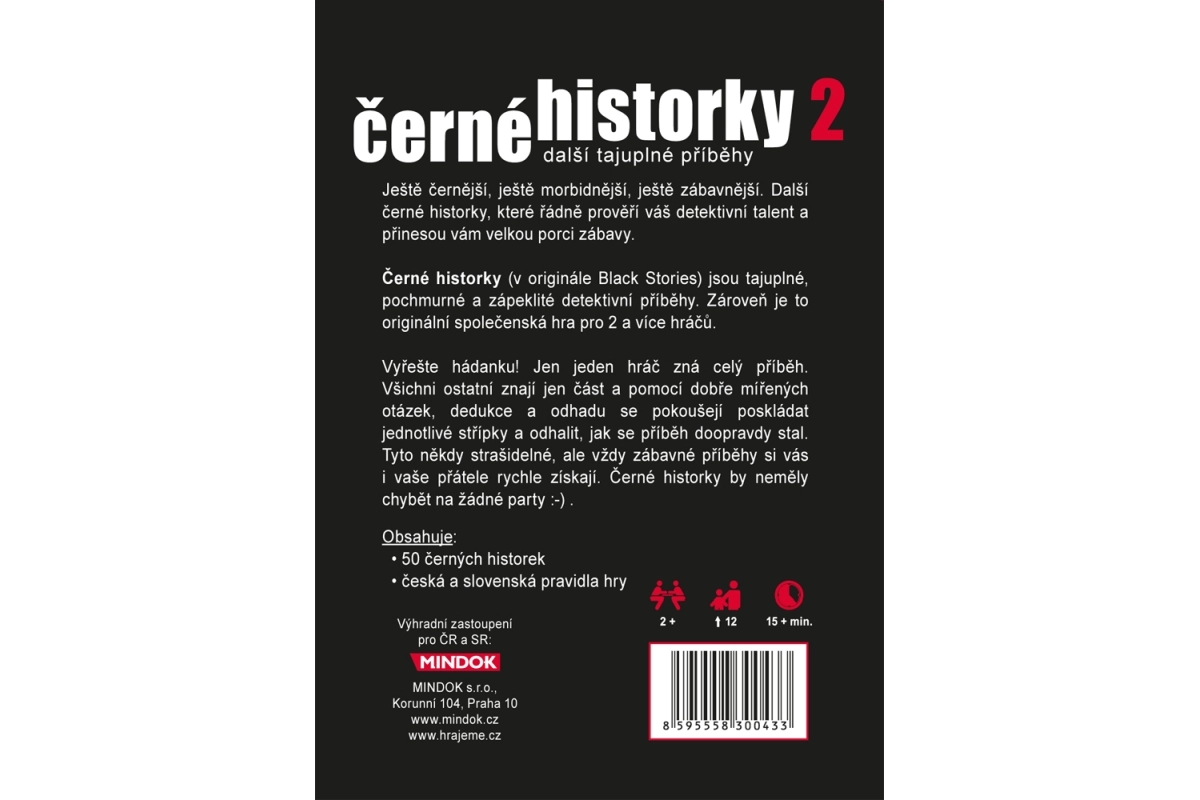 Ještě černější, ještě napínavější a rozhodně ještě zábavnější! Černé historky 2 přinášejí novou sadu záhad, které rozproudí každou párty. Jeden hráč zná celý příběh, ostatní se pomocí chytře mířených otázek snaží zjistit, co se doopravdy stalo.