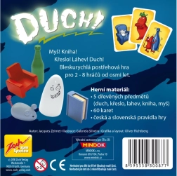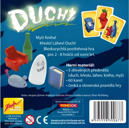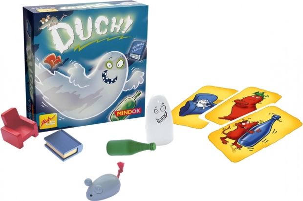 Ve hře Duch leží uprostřed stolu pět dřevěných předmětů – bílý duch, zelená láhev, modrá kniha, červené křeslo a modrá myš. Otočí se karta a hráči se snaží co nejrychleji popadnout předmět, který odpovídá pravidlům. Někdy je to přesná shoda obrázku a barvy, jindy naopak předmět a barva, které na kartě vůbec nejsou. Rychlá, napínavá a velmi návyková zábava pro celou rodinu.
