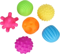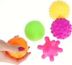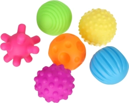 Každý míček má jedinečný povrch (malé a velké výstupky, žebrování, drážky, „ježek“), který podporuje hmat a zvídavost dítěte.