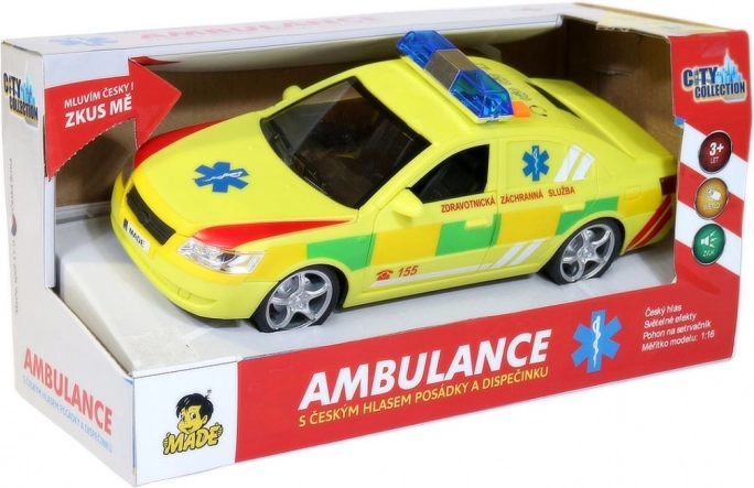 Realistická sanitka 1:16 se světly, českými hláškami a jízdou na setrvačník. Otevírací dveře, baterie AG13 v balení. Skvělá hračka pro děti od 3 let.