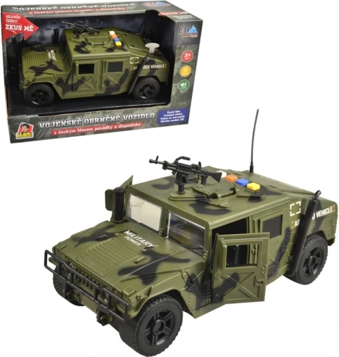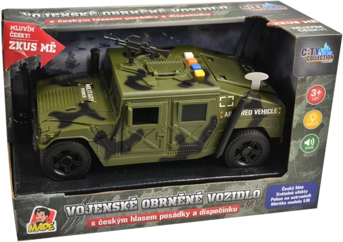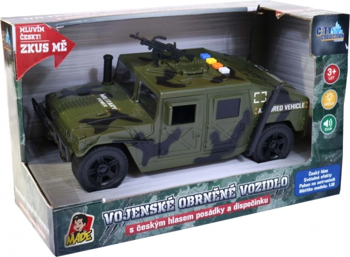 Objevte akční vojenské auto pro dětskou fantazii a napínavé mise. Obrněné vozidlo v měřítku 1:16 jezdí na setrvačník, má robustní kola, realistické detaily a otevírací dveře. Díky českým hlasům posádky a dispečinku, světelným efektům a zvuku střelby vytváří autentickou atmosféru vojenských operací.