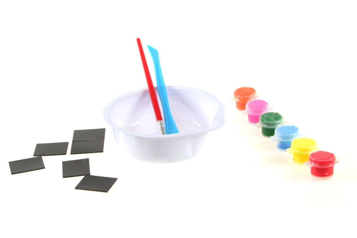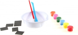 - Sádra, plastová miska, plastová forma s 6 motivy, 6 barviček, štěteček, magnety, návod