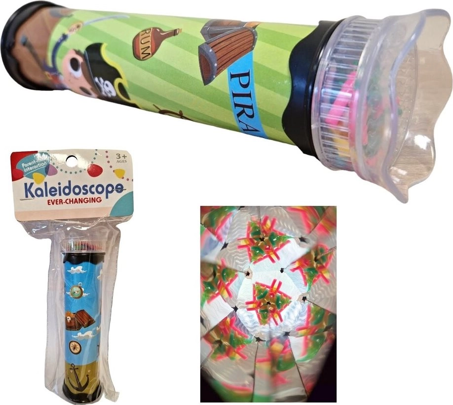 Tento dětský kaleidoskop s motivem pirátů přináší fascinující svět barev a tvarů. Díky soustavě zrcadel a barevných prvků vznikají při pohledu proti světlu nápadité a originální obrazce, které se neustále mění. Perfektní zábava pro zvědavé děti i malé objevitele.