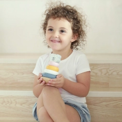 Sada obsahuje šest pastelově barevných kroužků, včetně hlavního kroužku s medvědí hlavou, které rozvíjí vizuální a motorické dovednosti.
