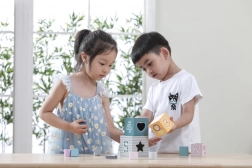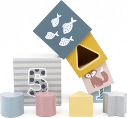 - Děti mohou kostky volně skládat, učit se čísla, přiřazovat tvary v třídiči a poznávat zvířátka
