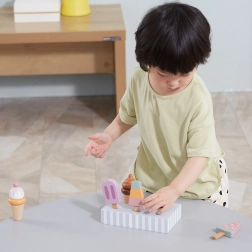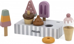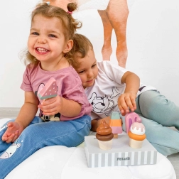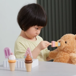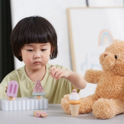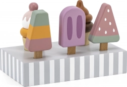 Barevná sada pěti dřevěných nanuků na pevném stojánku pro kreativní hraní na obchod i kuchyňku. Hračky z kvalitního dřeva s netoxickými barvami podporují jemnou motoriku, fantazii a společenské dovednosti. Ideální pro rolové hry a stylovou prezentaci i ukládání v dětském pokojíčku.