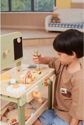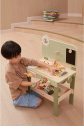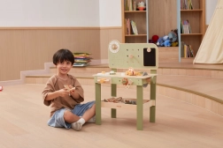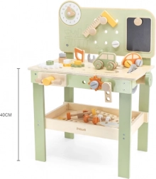 Stylový dětský ponk v přírodně‑zeleném provedení nabízí realistický zážitek z dílny v bezpečné, dřevěné podobě. Děti mohou šroubovat, měnit kolečka u autíčka, "řezat" dílky, skládat ozubená kola a objevovat principy příčiny a následku. Díky přehlednému úložnému prostoru zůstanou všechny díly a nářadí vždy po ruce.