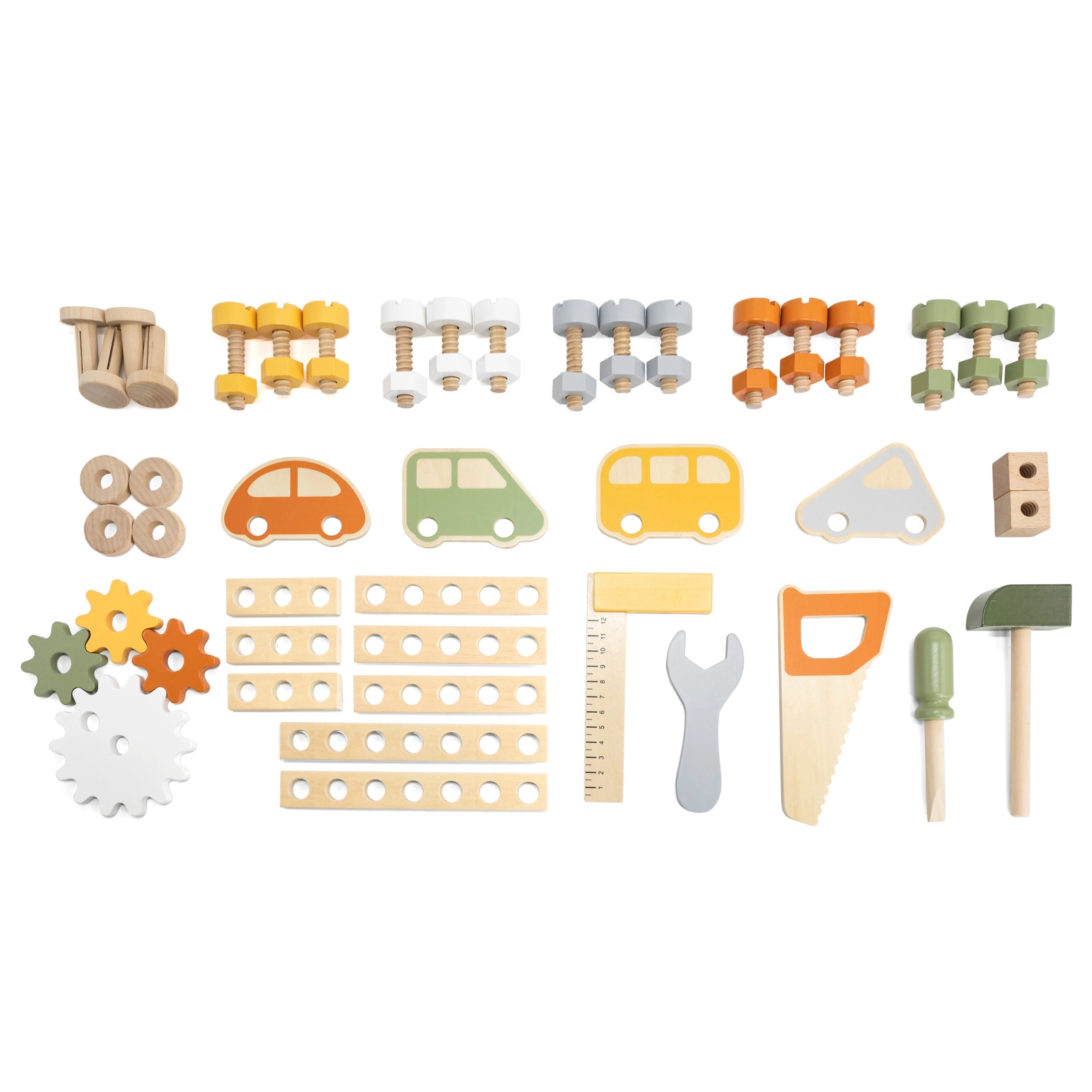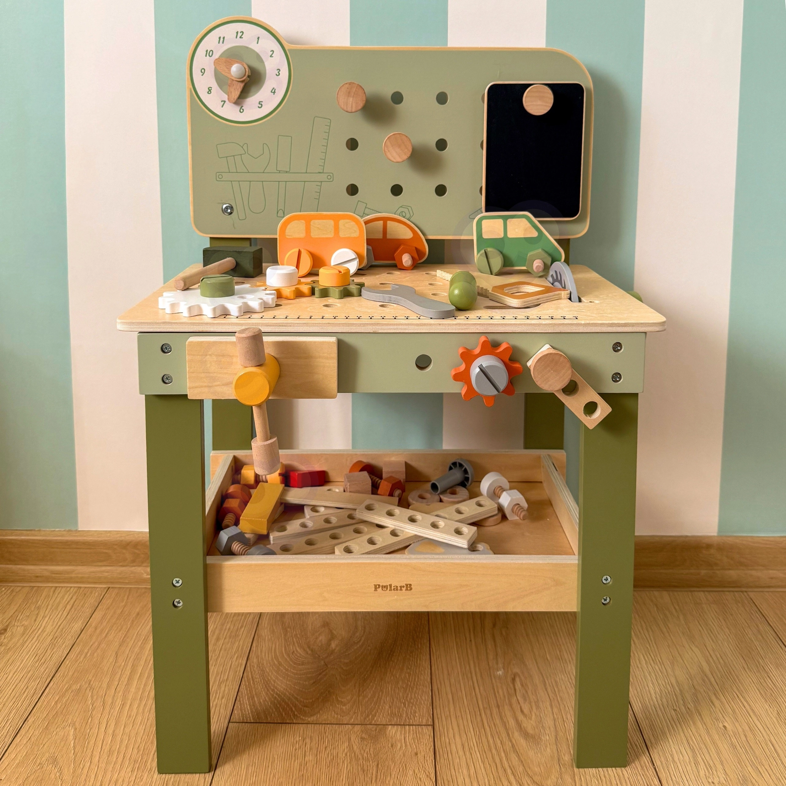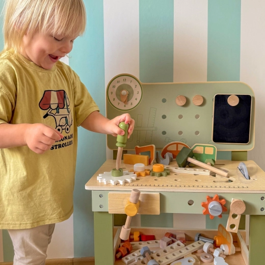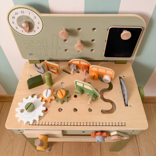 Součástí je sada nástrojů (kladívko, klíč, šroubovák), šroubky, matice, ozubená kola, panel s učebními hodinami a praktická polička na odkládání. Děti mohou sestavovat vlastní výtvory, „opravovat“ a třídit díly – ideální pro rozvoj kreativity, trpělivosti a plánování.