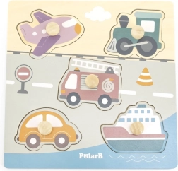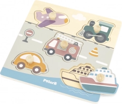 Tato dřevěná vkládačka s tématem dopravních prostředků je ideální hračkou pro děti od 18 měsíců. Dílky s praktickými dřevěnými knoflíky skvěle padnou do malých ručiček a podporují správný úchop, rozvoj motoriky i logického myšlení. Pestrobarevné ilustrace letadla, vlaku, hasičského auta, auta a lodi děti zábavnou formou seznamují se světem dopravy.