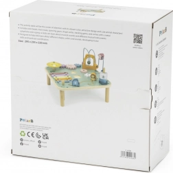 Korálkový labyrint, ozubená kolečka, posuvné prvky i třídění tvarů v jednom stole pro rozvoj jemné motoriky a logiky.