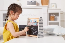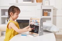 Součástí je malá tabule a bezprašná křída pro psaní číslic, první příklady i vlastní obrázky – ideální pro rozvoj kreativity.