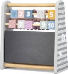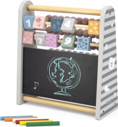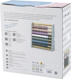 Toto multifunkční dřevěné počítadlo 3 v 1 spojuje učení a hru v jeden celek. Děti si pomocí barevných korálků procvičí počítání, s překlápěcími kostkami s čísly se naučí rozpoznávat číslice a jednoduché vztahy a na tabuli s křídou mohou psát či kreslit své první příklady i obrázky.