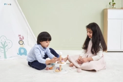 Hra na čajový dýchánek rozvíjí komunikaci, fantazii a spolupráci mezi dětmi. Barevné dortíky lákají k třídění a počítání, šálky a lžičky podporují koordinaci oko–ruka a jemnou motoriku. Elegantní design v jemných barvách pěkně zapadne do každého dětského pokojíčku.