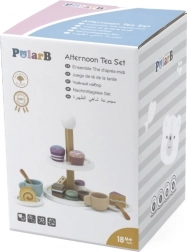 Dřevěný čajový set je ideální pro první společenské hry dětí. Dvoupatrový stojan s dezerty, dva talíře, dva šálky a lžičky vytvoří dokonalou scénu pro odpolední čaj i slavnostní hostinu. Díky pečlivému zpracování z odolného dřeva je hračka příjemná na dotek a bezpečná pro malé ruce.