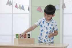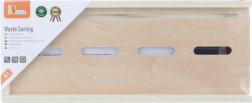 Hračka učí děti správnému třídění odpadu s využitím hravých dřevěných destiček a barevně označených košů.