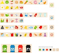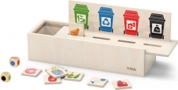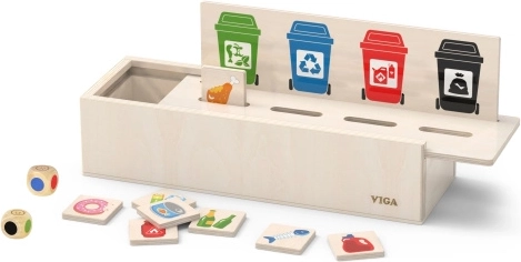 Tato vzdělávací hračka VIGA je ideální pro děti, které se učí základům třídění odpadu. Dodává se s dřevěnou krabicí, která má otvory pro vhazování destiček a tabulkou s různými odpadkovými koši. Zahrnuje také 50 dřevěných destiček s obrázky odpadu a barvami odpovídajícími recyklačním kategoriím.