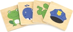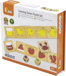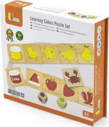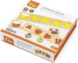 Dřevěná výuková hra, díky které se děti naučí rozlišovat barvy a správně je přiřazovat k obrázkům. Děti nejenže poznávají barvy, ale také získávají povědomí o předmětech, rostlinách nebo zvířatech spojených s těmito barvami, což posiluje jejich znalosti o světě kolem nich.