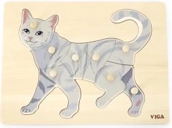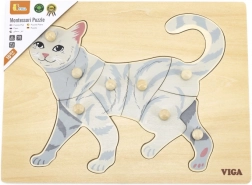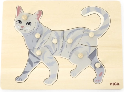Úkolem dítěte je složit obrázek kočky nejen podle ilustrace, ale i podle tvaru jednotlivých dílků. Knoflíkové úchytky usnadňují uchopení malými prsty a podporují správné vedení ruky. Pevná dřevěná deska drží dílky jistě na místě a odolá každodennímu používání.