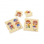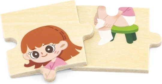 Tato kvalitní dřevěná vzdělávací hračka učí děti správnému postupu oblékání formou skládání navazujících dílků s obrázky chlapce a dívky. Každý dílek má jedinečný motiv a přesně do sebe zapadá, takže si děti při hře procvičí vnímání souvislostí i trpělivost.