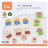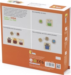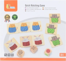 Dřevěná hra rychlé párování od značky VIGA je rodinná společenská hra, která trénuje postřeh, logiku a paměť. Hráči hází 1–3 kostkami a hledají správné zvířátko s odpovídajícím vzorem na tričku a barvou. Vyrobeno z kvalitního dřeva a barveno netoxickými barvami – bezpečné pro děti.