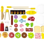 Zelenina, maso, koření, talíře, příbory, kleště i špízové tyčky – vše, co děti potřebují k přípravě burgerů, špízů a sendvičů.