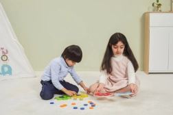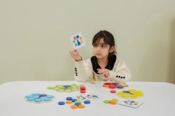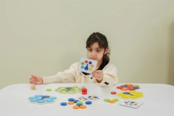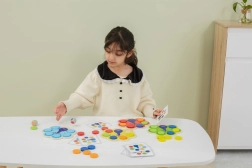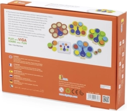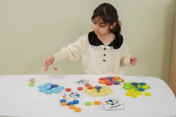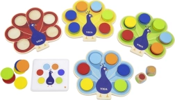 Děti přiřazují kotoučky podle karet nebo hodu kostkou, přirozeně si osvojují barvy a trénují pozornost i logiku.