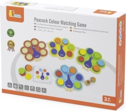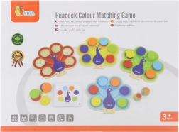 Součástí je 4× dřevěná deska páva, 36 kotoučků v 6 barvách, 20 oboustranných zadání a 2 kostky s barvami. Hra podporuje samostatnou i týmovou činnost a skvěle připravuje na předškolní vzdělávání.