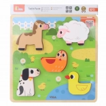 Tato roztomilá dřevěná skládačka s tématem farmy obsahuje 5 robustních dílků – koníka, ovečku, slepičku, pejska a kachničku. Děti vkládají zvířátka do odpovídajících otvorů na barevné podložce, čímž si trénují rozpoznávání tvarů a vizuální paměť.